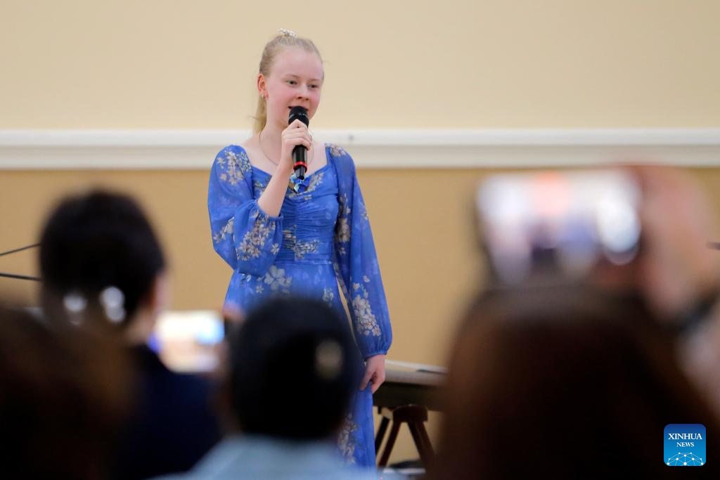 A student performs during an event organized by Confucius Institute of Transilvania University of Brasov to mark the UN Chinese Language Day in Brasov, central Romania, April 19, 2024. (Photo by Cristian Cristel/Xinhua)