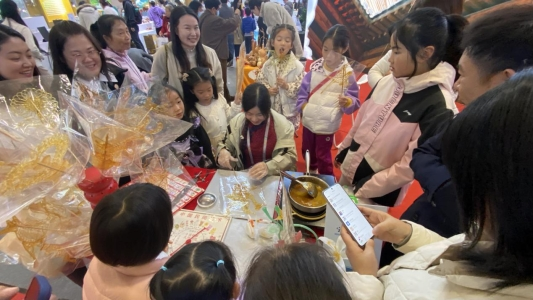 多位非遺傳承人現(xiàn)場(chǎng)表演技藝,也把展廳氛圍推得更上層樓。山東省泰安市寧陽縣李氏糖畫第六代傳承人李然然帶著她的“甜蜜”作品來到現(xiàn)場(chǎng)。一鍋、一勺、一鏟、一點(diǎn)糖,就繪制出了壯美山東、和美生活。“簡(jiǎn)直是藝術(shù)品!”“憑本事吃飯!”“這誰舍得吃啊!”現(xiàn)場(chǎng)驚嘆聲此起彼伏。