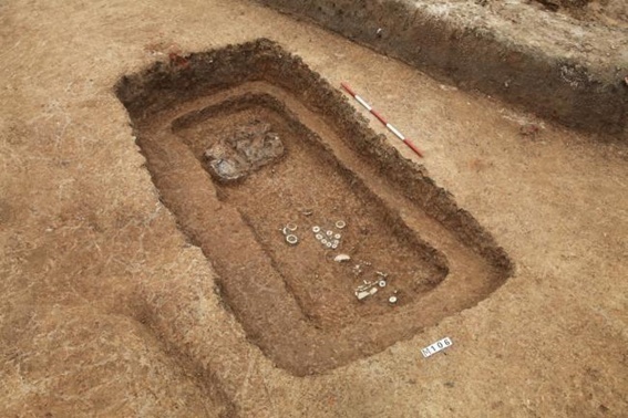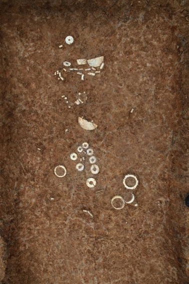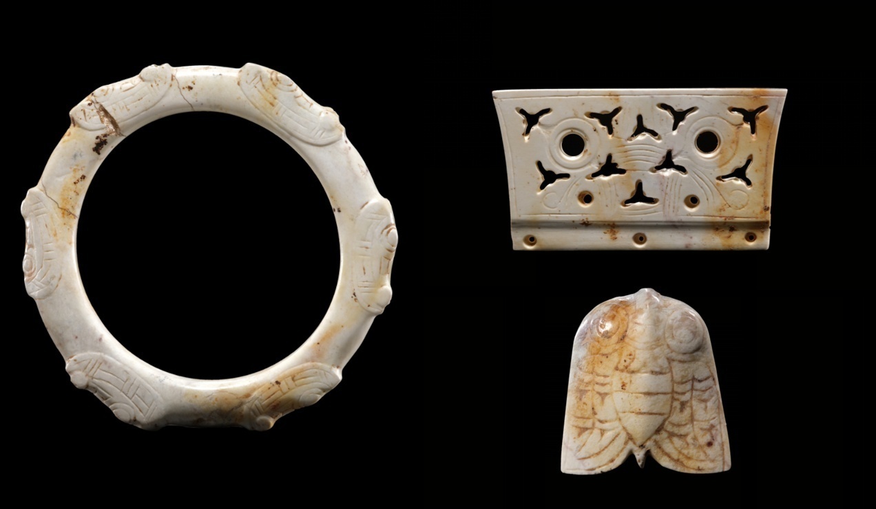 良渚文化一般分為早、中、晚三期。良渚文化早期階段,通過對北村、南王廟等遺址調查發掘,以及瑤山外圍等聚落結構新線索的分析,建立了前古城時代良渚遺址群聚落分布的新認識。北村遺址位于莫角山以南3公里,面積8萬平方米,分南北兩部分,主體堆積屬良渚文化早期偏早階段。北村南地點可分為高、低兩級臺地,兩級臺地之間存在明顯的陡坡,坡底分布有圍溝,推測為有意將高臺地的高等級居住區、墓葬與低臺地的平民居住區、墓葬相隔離,顯示出聚落內部明顯的社會分化現象。女性墓葬M106出土隨葬品70件,包括玉蟬、龍首鐲、鏤孔獸面紋冠狀器、璜串等重要玉器,是同時期的一座高等級墓葬。