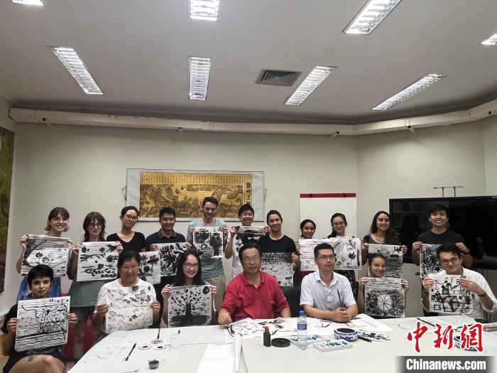 日前,湖北大學藝術學院譚崇正、鄧鴻濤兩位書畫名家走進圣保羅州立大學孔院及當地多所公立小學,開展水墨畫工作坊。圖為水墨畫教學現場。中新社記者林春茵攝