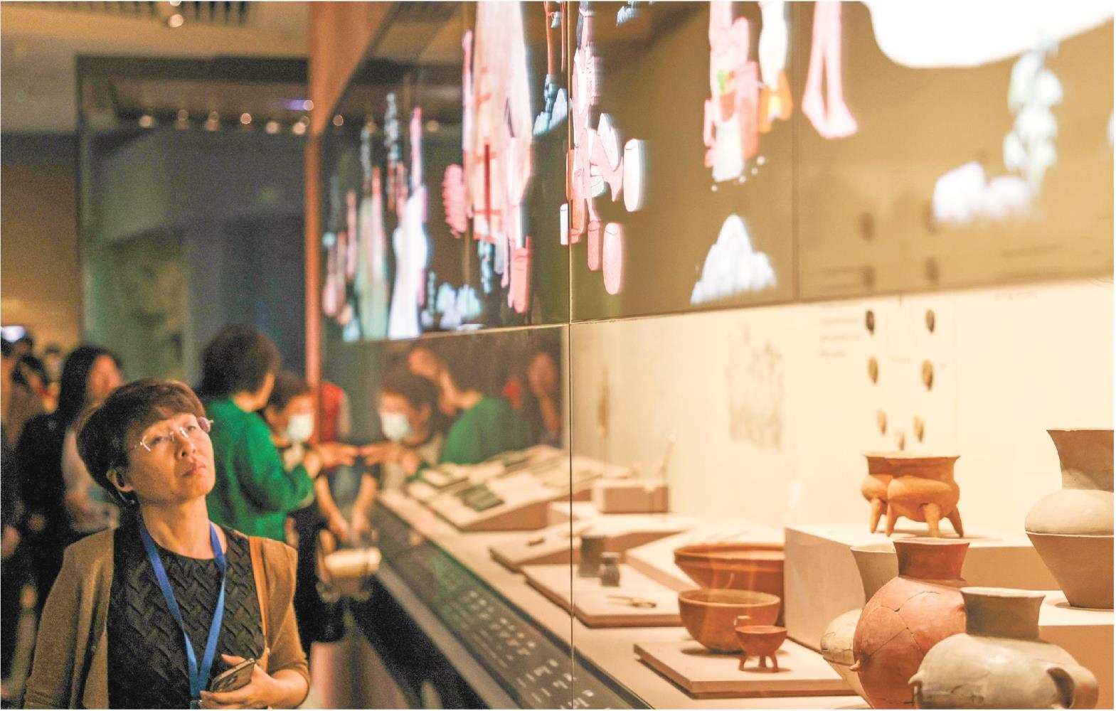 觀眾在參觀“海岱日新—山東歷史文化展”展出的史前時期陶器。(新華社發)