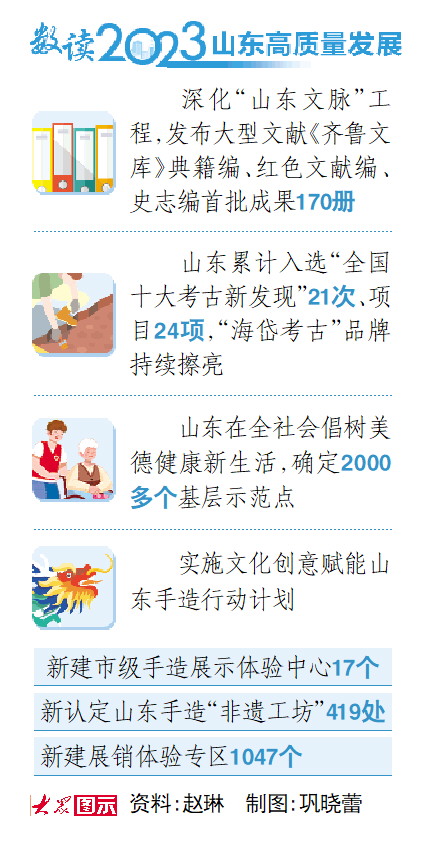 2022年,山東印發實施《關于打造中華優秀傳統文化“兩創”新標桿行動計劃(2022-2025年)》,文化“兩創”工作全面起勢,聚力打造7個新標桿。其中,賡續“山東文脈”被確定為重點文化工程,計劃用10年左右時間,全面研究、保護、輯錄和整理出版山東歷代傳世文獻,同步建設齊魯文獻數字化文庫和新媒體傳播平臺。