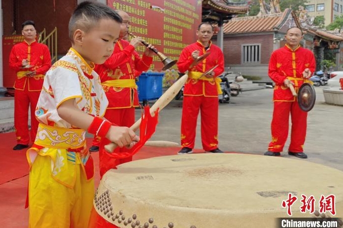 14日,年僅7歲的林嘉銘代替爺爺上陣打大鼓。 吳冠標 攝