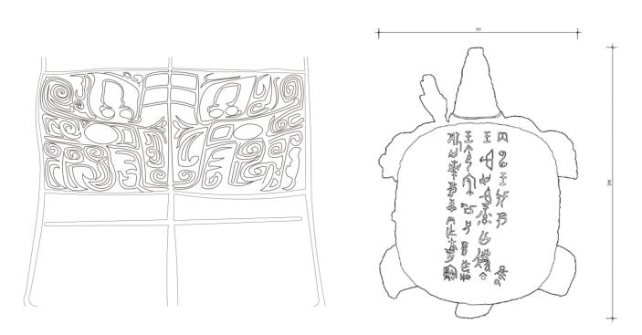 用數(shù)字化手段無損提取青銅器文物的關(guān)鍵信息,圖左為提取的紋樣線圖,圖右為從作冊般黿提取的信息。中國國家博物館供圖