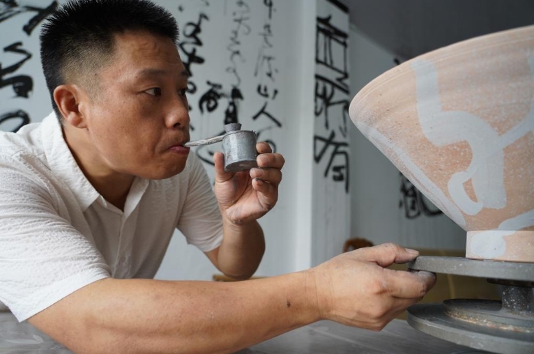 在陶藝街“字非字”工作室,江西陶瓷工藝美術職業技術學院教師尹志軍將書法筆畫拆解后,以設計為魂、繪畫為魄,重構文字之美,形成獨特的藝術風格,作品被中國工藝美術館收藏;