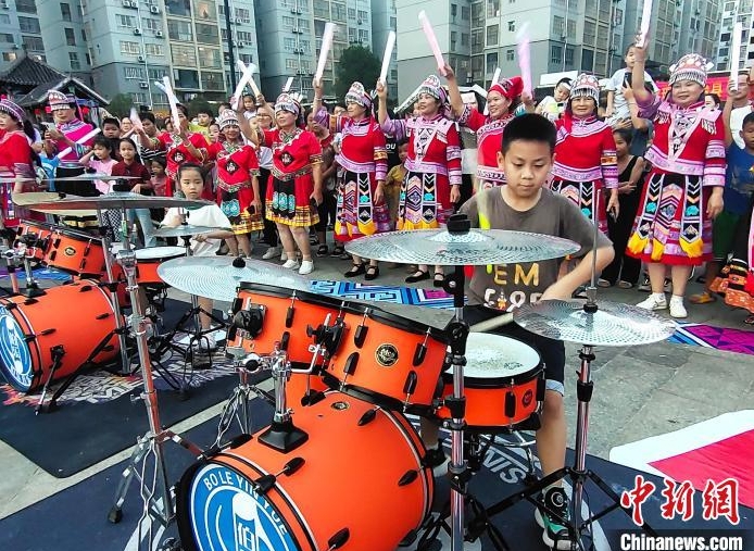 7月3日至4日,廣西大化瑤族自治縣舉辦2024年“祝著節”慶祝活動。圖為10歲的韋榮樂(右)在用架子鼓演奏《霍元甲》。 中新社記者 黃艷梅 攝
