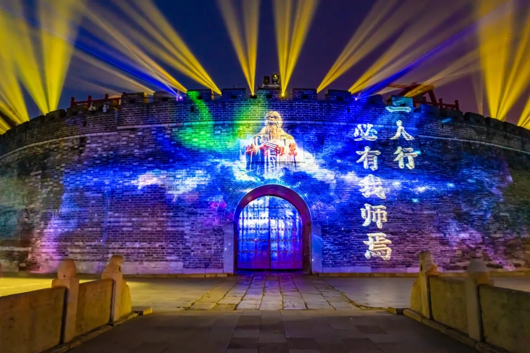 在萬仞宮墻上,光影演藝《大哉孔子》無疑是一場將古老文化與現代科技完美融合的視覺盛宴。這面承載著歷史滄桑的宮墻,在夜幕的降臨下,被賦予了全新的生命與活力。