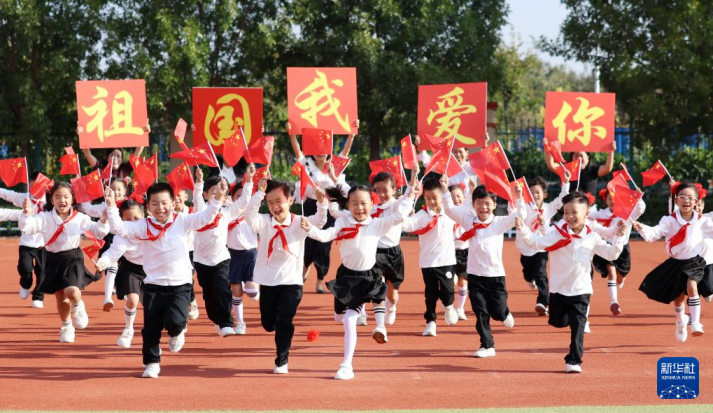 山東郯城縣第一實(shí)驗(yàn)小學(xué)學(xué)生手持國(guó)旗快樂(lè)奔跑,喜迎國(guó)慶節(jié)的到來(lái)。