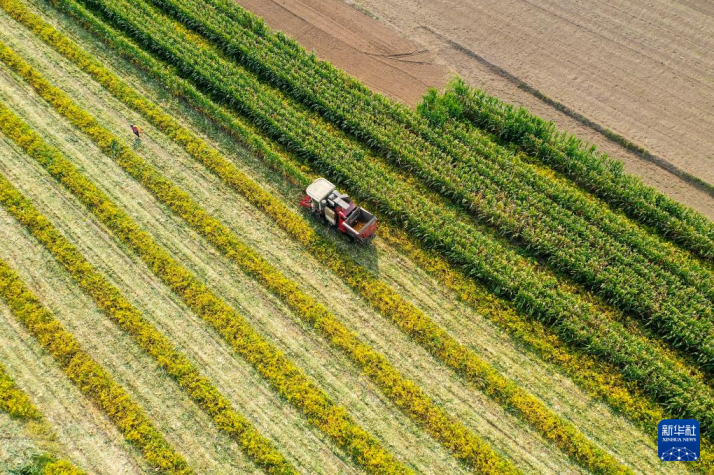在山東廣饒縣樂(lè)安街道北朱耿村的大豆玉米帶狀復(fù)合種植田地里,農(nóng)民駕駛收割機(jī)收割玉米。