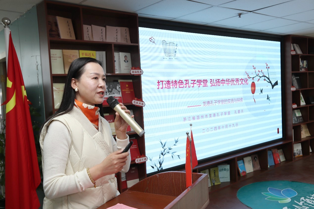 中國孔子基金會孔子學堂推進委員會委員、浙江省溫州市龍港孔子學堂的負責人孔愛月作了《打造特色孔子學堂 弘揚中華優秀傳統文化》主旨分享,結合龍港孔子學堂的實踐和探索,介紹了推動孔子學堂高質量發展的經驗和方法,為在場的文化工作者和參與者提供了寶貴啟示和借鑒。