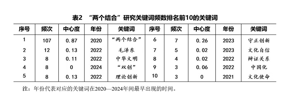 “兩個(gè)結(jié)合”研究關(guān)鍵詞相關(guān)度分析。關(guān)鍵詞出現(xiàn)的頻率往往反映某段時(shí)間該領(lǐng)域的研究熱點(diǎn)。因知識(shí)計(jì)量分析對(duì)數(shù)據(jù)“凈度”要求較高,為保障研究精度,筆者又以人工方式對(duì)上述文獻(xiàn)進(jìn)行數(shù)據(jù)清洗,人工比對(duì)和閱讀每一篇文章的摘要、關(guān)鍵詞等基本信息,刪除與“兩個(gè)結(jié)合”主題相關(guān)度較低的文獻(xiàn),得到時(shí)間跨度為2020年至2024年的有效文獻(xiàn)256篇,以此作為CiteSpace關(guān)鍵詞分析的樣本數(shù)據(jù)。在本研究所選取的256篇論文中,樣本中詞頻排在前10位的關(guān)鍵詞分別是“兩個(gè)結(jié)合”(107)、毛澤東(12)、中華文明(8)、“兩創(chuàng)”(8)、理論創(chuàng)新(8)、守正創(chuàng)新(7)、文化自信(5)、辯證關(guān)系(4)、中國化(3)、文化使命(3),關(guān)鍵詞的中心度越強(qiáng),說明其與主題聯(lián)系越緊密(如表2所示)。