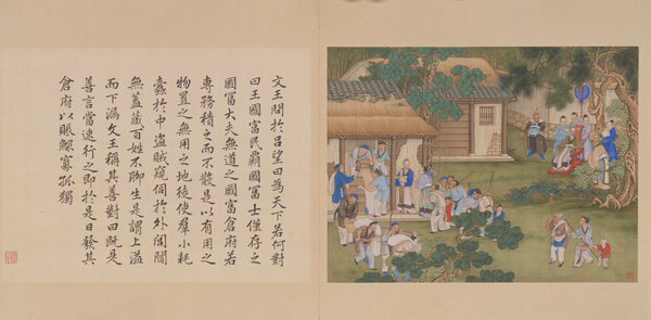 同時,古代帝王對皇子們也積極進行儒學教育。明代編纂有蒙學讀本《養正圖解》,輯錄周文王至宋代的傳說故事,并附有60幅圖解。繪圖解說竭力闡述儒家的綱常觀念及倫理思想,教育皇子修身養性,以求有益于治國平天下。此書也深受清代統治者喜愛,此次展覽展品中有清代重繪的《養正圖解》。