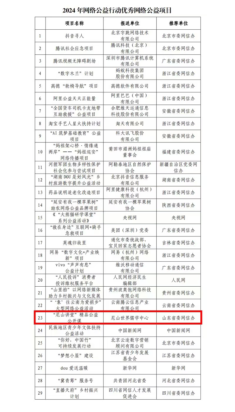 “尼山講堂”精品公益公開課入選2024年網絡公益行動優秀網絡公益項目