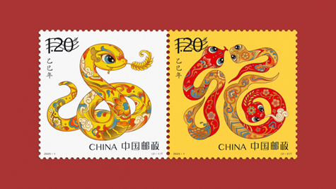 我國從1980年開始發(fā)行生肖郵票以來,年年發(fā)行。2025年1月5日發(fā)行《乙巳年》生肖郵票,全套兩枚。第一枚圖名為“蛇呈豐稔”,畫面提煉了中華傳統(tǒng)文化中盤蛇的靈動意象,加以喜慶裝飾應(yīng)和年節(jié)氛圍。金色的蛇軀蜿蜒,口中銜著一束“嘉禾”,象征著“倉廩實,衣食足”的美好圖景。第二枚圖名為“福納百祥”,畫面以草書筆意將三條蛇創(chuàng)意性地構(gòu)成了“福”的字形,簡練灑脫、柔美順通。兩大一小三條蛇之間情感細(xì)膩流動,顧盼生情,生動展現(xiàn)了闔家歡樂的溫馨場景,寓意著和合共生、福滿人間,寄托了人們對美好生活的無限追求與誠摯祈愿。