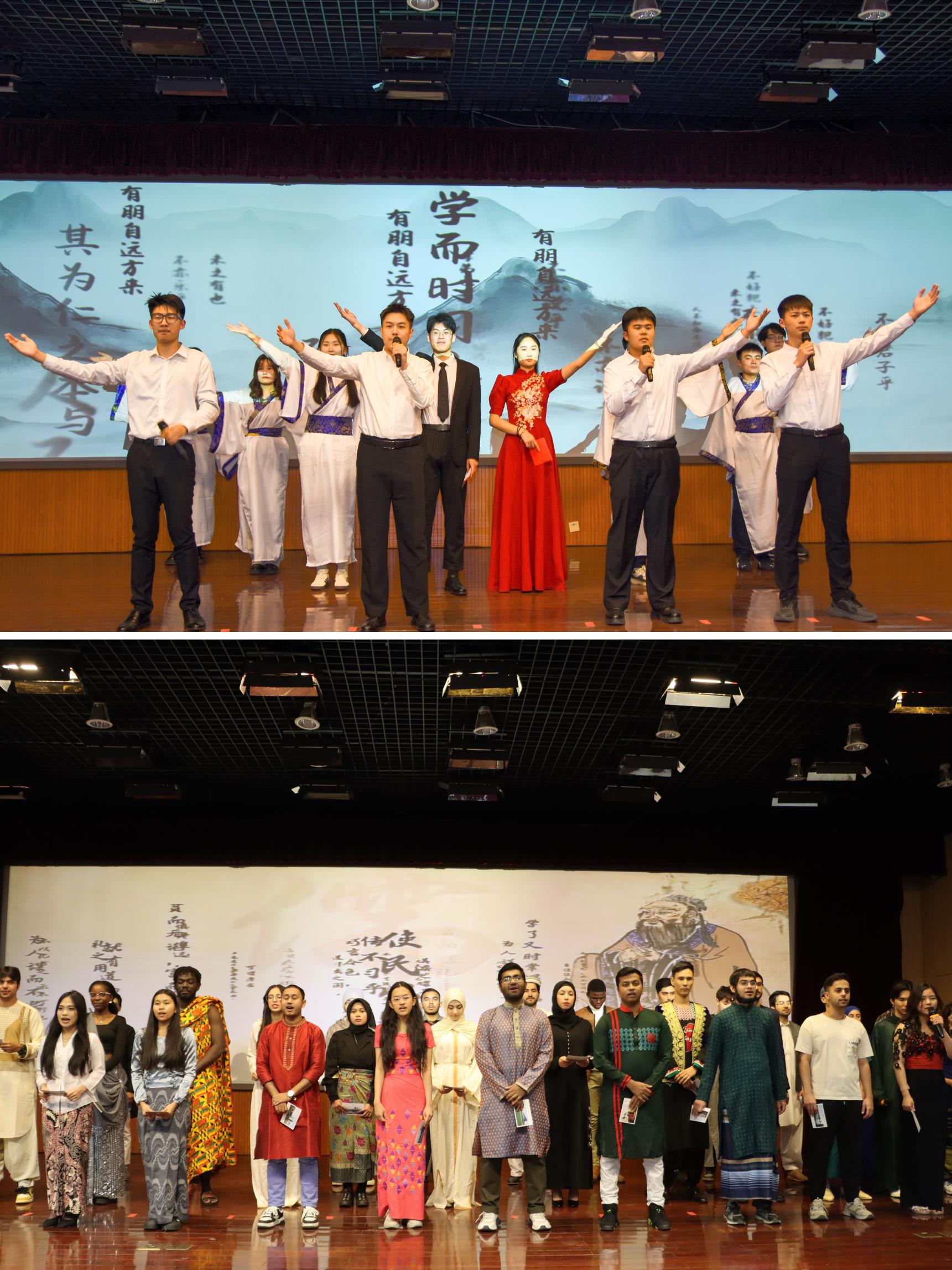 活動(dòng)現(xiàn)場(chǎng),中國(guó)石油大學(xué)(華東)文法學(xué)院、外國(guó)語學(xué)院的大學(xué)生們以及國(guó)際教育學(xué)院的留學(xué)生們用多語言誦讀《論語》經(jīng)典篇章,通過豐富多元的藝術(shù)表現(xiàn)形式,對(duì)經(jīng)典進(jìn)行了創(chuàng)新演繹,將儒家深厚的文化底蘊(yùn)融入現(xiàn)代舞臺(tái)表演。