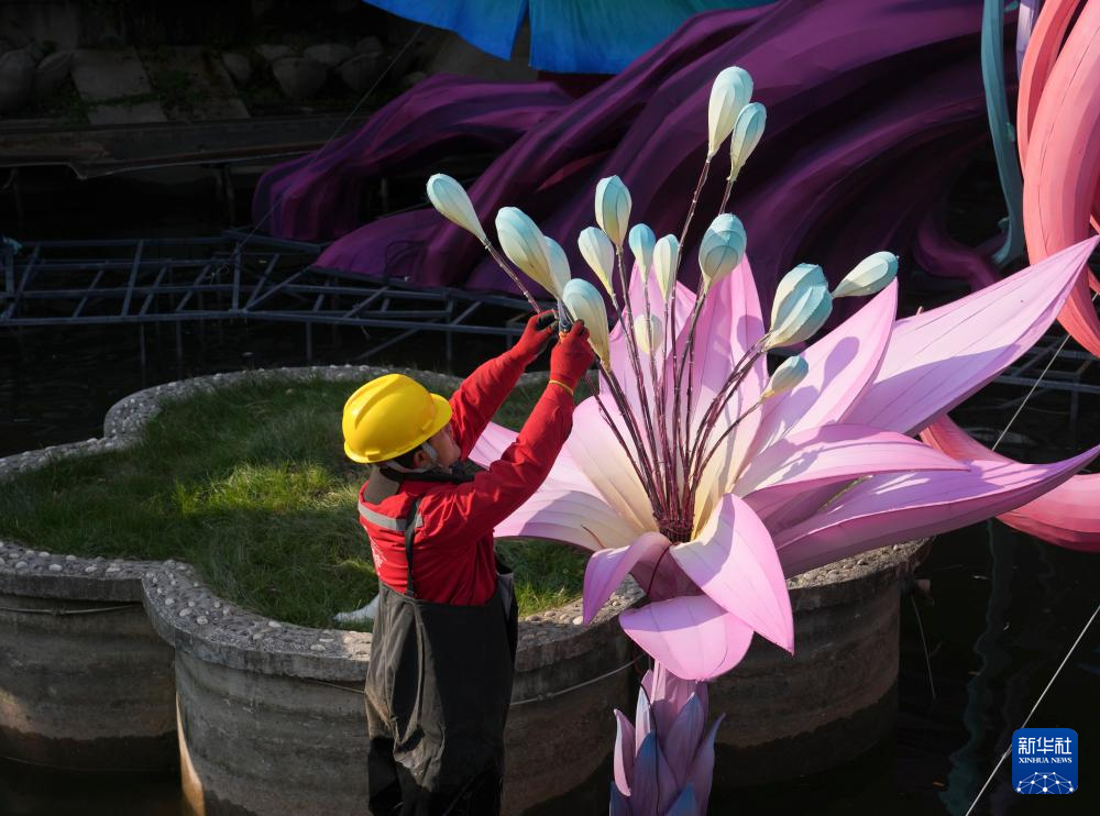 12月17日,施工人員在上海九曲橋邊布置用于上海豫園燈會的燈組。