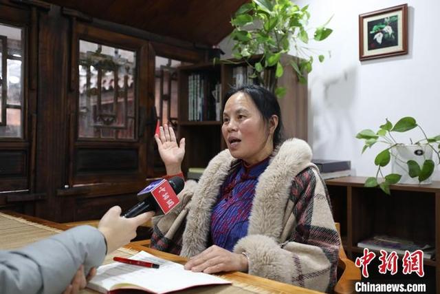 苗繡傳承人石麗平接受中新社記者采訪。 瞿宏倫 攝