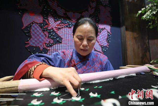 苗繡傳承人石麗平在繡制苗繡產品。 瞿宏倫 攝